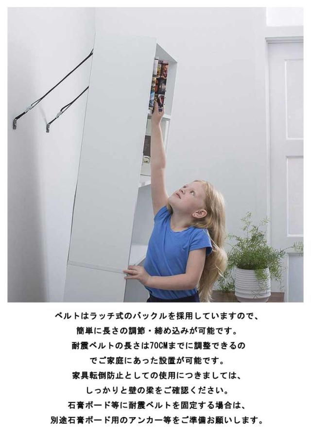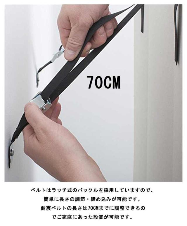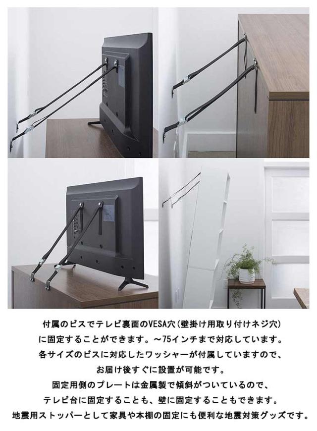 | 取り付け簡単なベルト式で安全な家具転倒防止耐震グッズです。 ベルトの長さは簡単に調節ができ、ナイロン繊維でできたベルトが揺れや振動を吸収する効果もあります。 つっぱり棒や耐震マット・耐震ジェルよりも強固な耐震対策が簡単にできます。テレビ転倒防止ベルトは、大型のTVだけでなく家具や本棚の転倒防止にも使用できます。 付属のビスでテレビ裏面のVESA穴(壁掛け用取り付けネジ穴)に固定することができます。〜75インチまで対応しています。各サイズのビスに対応したワッシャーが付属していますので、お届け後すぐに設置が可能です。固定用側のプレートは金属製で傾斜がついているので、テレビ台に固定することも、壁に固定することもできます。地震用ストッパーとして家具や本棚の固定にも便利な地震対策グッズです。 ベルトはラッチ式のバックルを採用していますので、簡単に長さの調節・締め込みが可能です。耐震ベルトの長さは70cmまでに調整できるのでご家庭にあった設置が可能です。家具転倒防止としての使用につきましては、しっかりと壁の梁をご確認ください。石膏ボード等に耐震ベルトを固定する場合は、別途石膏ボード用のアンカー等をご準備お願いします。 | |