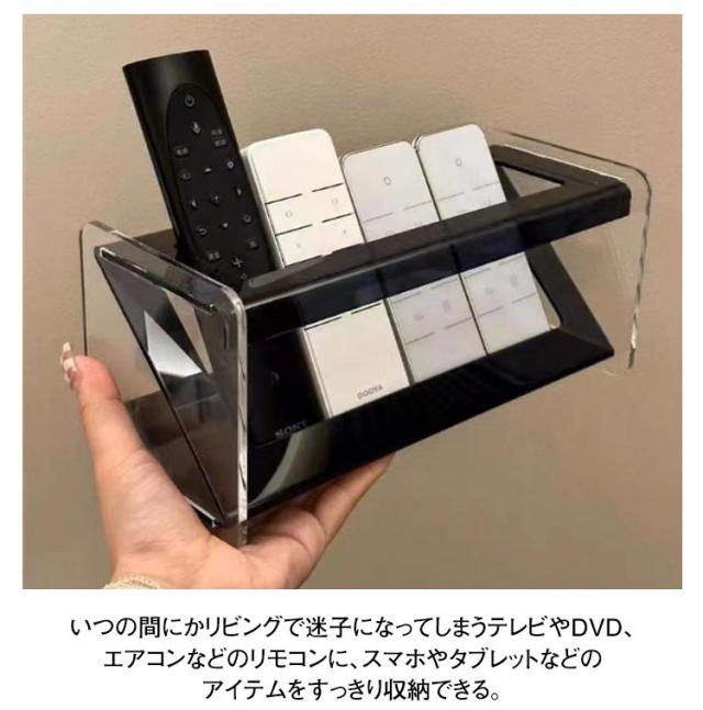 | どんなインテリアにも馴染みやすいアクリルリモコンラック。 リモコンの置き場所を確保しつつ、タブレットもひとまとめ! いつの間にかリビングで迷子になってしまうテレビやDVD、エアコンなどのリモコンに、スマホやタブレットなどのアイテムをすっきり収納できる。 くり抜かれたようなホール部分にササッと差し込むだけ。ちょっとしたプレゼントにもおすすめです。 隠れた足の部分にはちゃんと押さえが付いているので、差し込んだアイテムがだらしなく寝そべったりせず、凛とした立ち姿を披露してくれます。 デスクやテーブル、ベッドヘッドなど散らかりがちな場所に置けば、きちんと場所を確保できるのでいつでもどこでもスマート。 | |