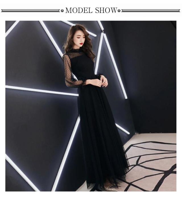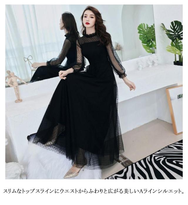フリルネック ブラック 結婚式 ワンピース シースルー パーティードレス 長袖 パーティードレス 透け感 ドット柄 ロングドレス お呼ばれ スタンドカラー マキシ丈 立ち襟 フォーマル 大人 上品 二次会