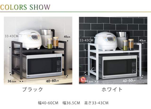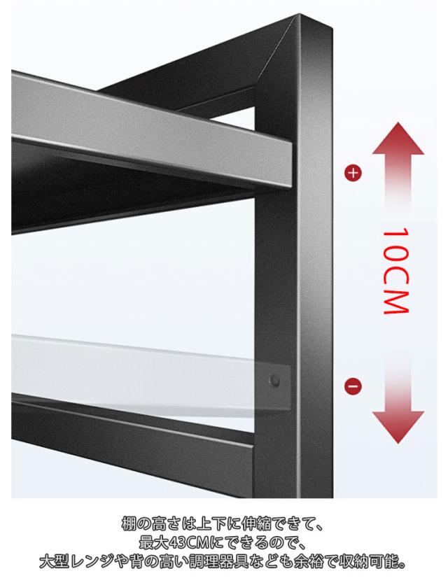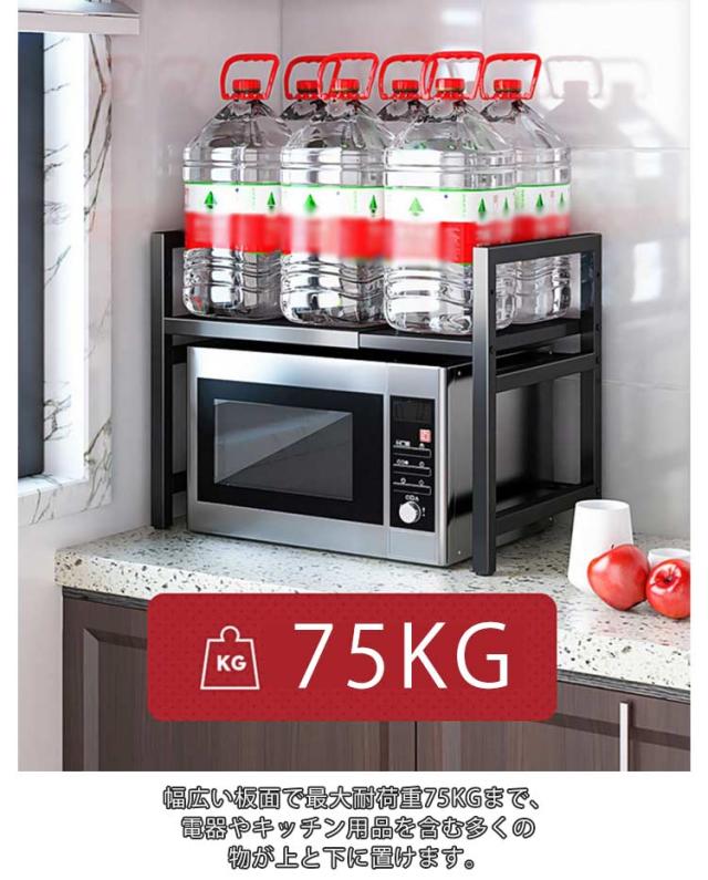 | 電子レンジの上を便利な収納空間に変えるレンジラック。 左右に伸縮できて、伸縮範囲40cm-60cmの間でニーズによって、自由に調節可能です。 棚の高さは上下に伸縮できて、最大43cmにできるので、大型レンジや背の高い調理器具なども余裕で収納可能。 幅広い板面で最大耐荷重75kgまで、電器やキッチン用品を含む多くの物が上と下に置けます。 20mm厚いスチールパネルで変形や壊れ等の心配なくて安定です。 上層の両側は落下防止のフレーム付き、置物倒れ防止可能です。 しっかり固定できるネジ接続部は、安心にご使用できます。 取り付けが簡単で、一人でただ10分間で完成できます! 水や汚れに強い紛体塗装を施したスチール素材なので、お手入れも簡単。 電子レンジやオーブン等の小家電に適用し、調味用品、キッチン用品を簡単に綺麗に収納できます。 | |