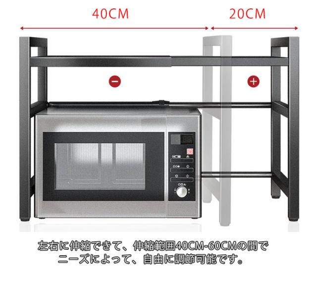 レンジ上ラック レンジ台 伸縮式 幅40〜60cm 耐荷重75kg 高さ調節可 レンジ上ラック 2段式 キッチン収納棚 組立簡単 ステンレス製 レンジラック お手入れ簡単 キッチン用品