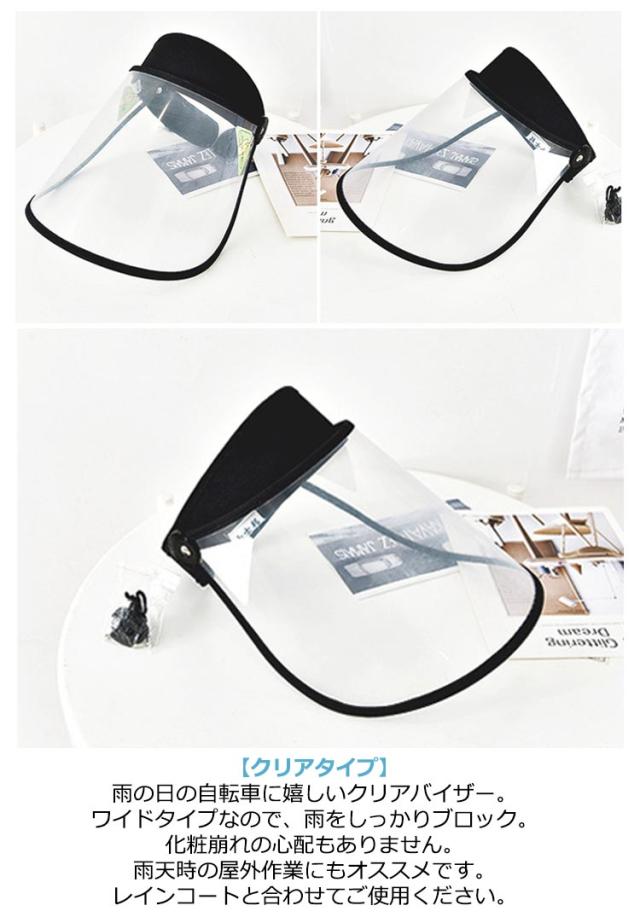 | ・天候に合わせて変えられる!360度回転角度段階調整つば!カチッと決まって動かない! 日差しの向きや雨の強さにより、バイザーの角度を変えられるので、とっても便利! ・着脱可能なあご紐付き!自転車使用でも飛ばされない フック部分にあご紐を引っ掛ける簡単取付け。風が吹いたり、自転車での使用でも飛ばされにくい。 【クリアタイプ】 雨の日の自転車に嬉しいクリアバイザー。 ワイドタイプなので、雨をしっかりブロック。化粧崩れの心配もありません。 雨天時の屋外作業にもオススメです。レインコートと合わせてご使用ください。 ※UVカットはありません ※ご使用前につばの保護フィルムを剥がしてご使用ください。 | |
