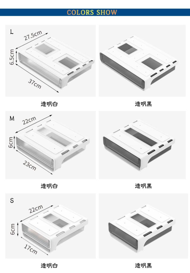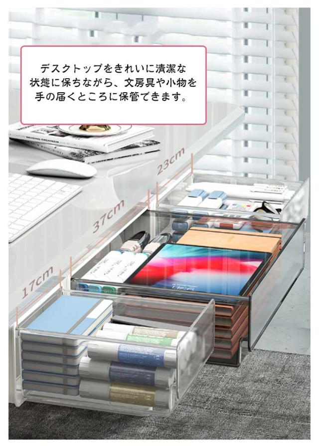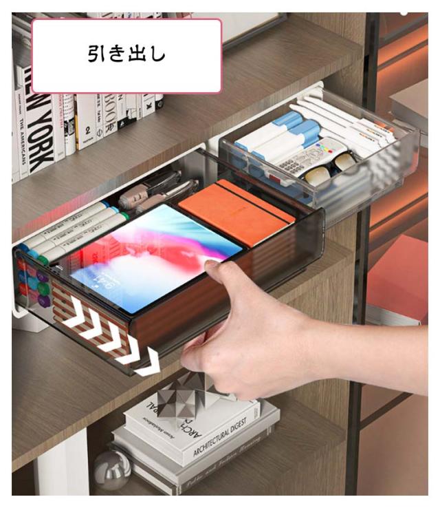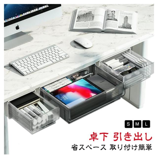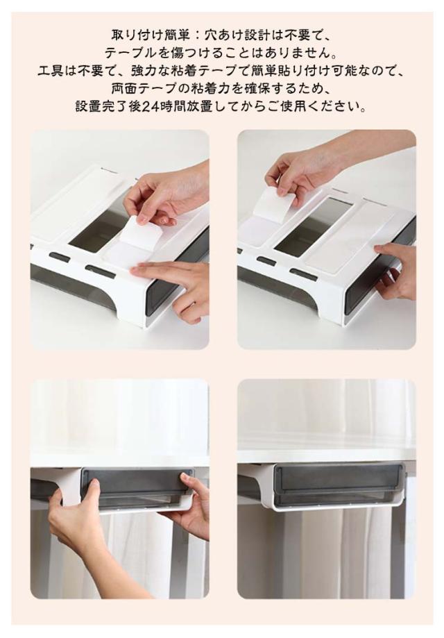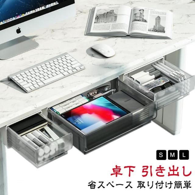 | 【卓下 引き出し】【S/M/L】 省スペース:机の下に設置して、大容量で透明であるため、物を探すのに便利です。収納ボックスは文房具収納、小物収納などに最適です。 デスクトップをきれいに清潔な状態に保ちながら、文房具や小物を手の届くところに保管できます。 取り付け簡単:穴あけ設計は不要で、テーブルを傷つけることはありません。 工具は不要で、強力な粘着テープで簡単貼り付け可能なので、両面テープの粘着力を確保するため、設置完了後24時間放置してからご使用ください。 | |