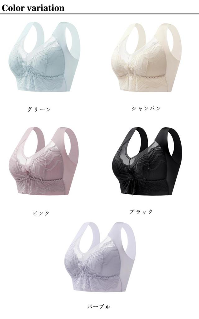 | ・軽くて締め付け感がないストレスフリーなノンワイヤーブラ ・昼夜兼用!24時間ご着用いただけます。 ・楽ちんな脱ぎ着! ・さらさら素材のシームレスで快適な着け心地 ・幅広設計によるしっかりとしたホールド力で、バストの下垂・横流れを防ぎます。 ・胸を持ち上げるパネル付でリフトアップ! ・幅広肩紐で肩凝り予防 ・通気性が良くムレにくい ・高級感あふれるレースで大人セクシー ・かわいいとセクシーを兼ね備えたデザイン ・ホック等はありませんので金属アレルギーの方も安心して着用いただけます | |