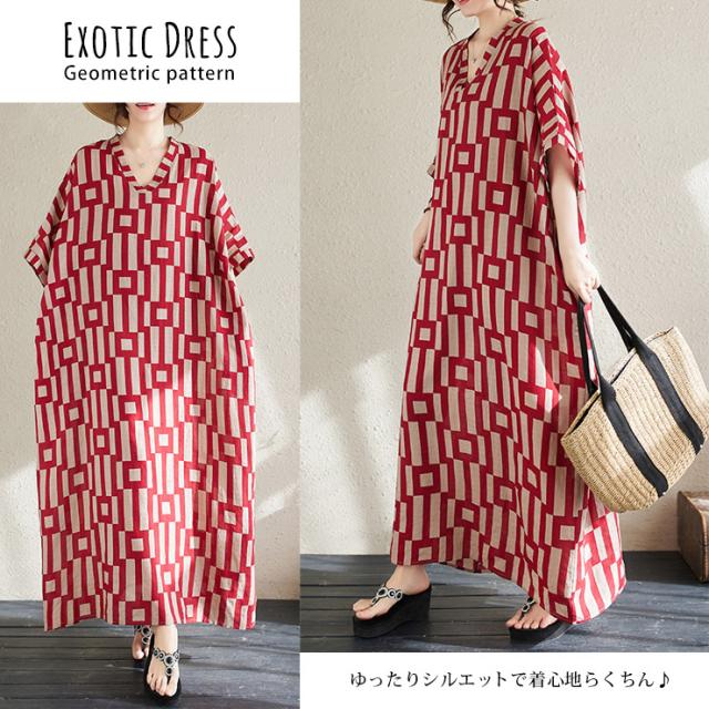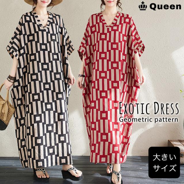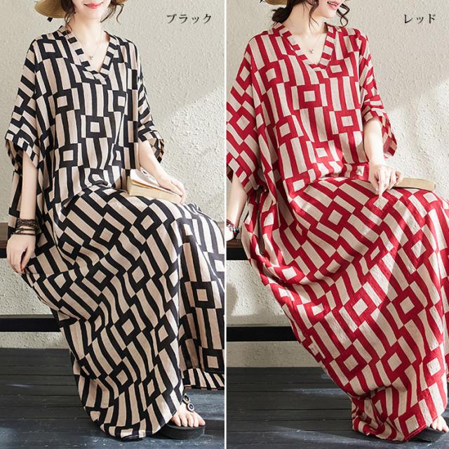 ★☆大きいサイズ レディース ロングワンピース マキシワンピ 幾何学ボーダー柄 半袖 ポンチョ Vネック 夏 LL 3L 4L 5L 6L ブラック レッド☆★