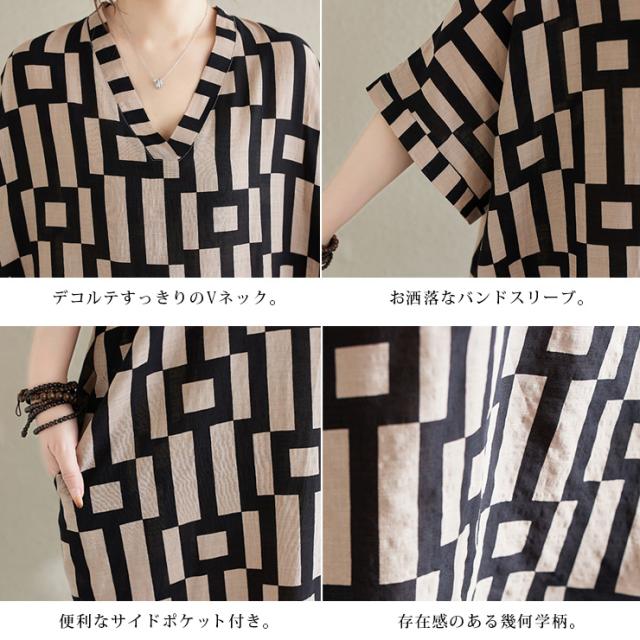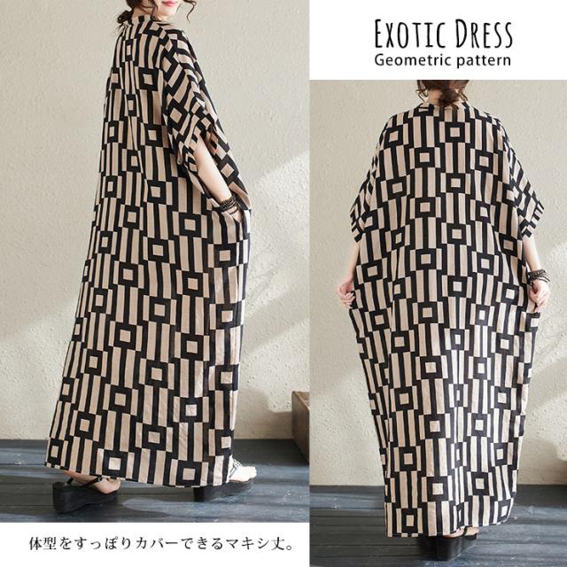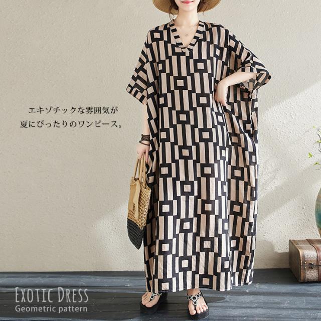 大きいサイズ レディース ロングワンピース マキシワンピ 幾何学ボーダー柄 半袖 ポンチョ Vネック 夏 (241067)