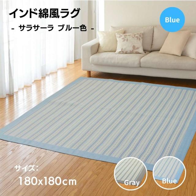 さるるの部屋 インド綿風ラグ さらさら ベタつきにくい サラサーラ ブルー色 180x180cm 2畳用 正方形 ストライプ柄 ふっくらウレタン入 ボーダー縁付 不織布貼り