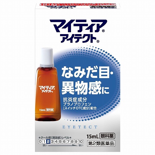 ●マイティアアイテクトは、抗炎症成分「プラノプロフェン」[スイッチOTC成分]を配合し、目の炎症から起こる「なみだ目、異物感(コロコロ・チクチクする感じ)、目のかゆみ、結膜充血」などの症状によく効きます。