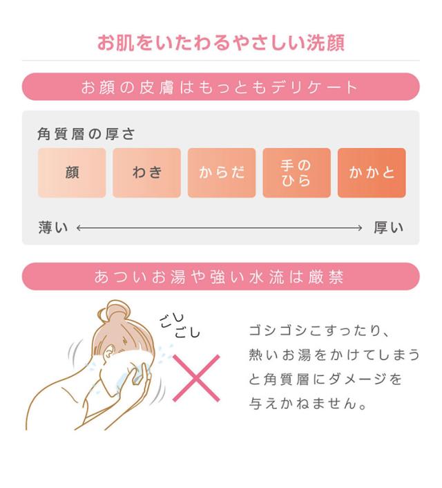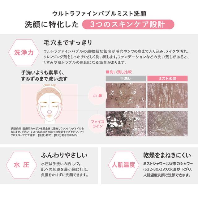 「洗顔に特化した3つのスキンケア設計」毛穴まですっきり洗浄力。ふんわりやさしい水圧。乾燥をまねきにくい人肌温度。