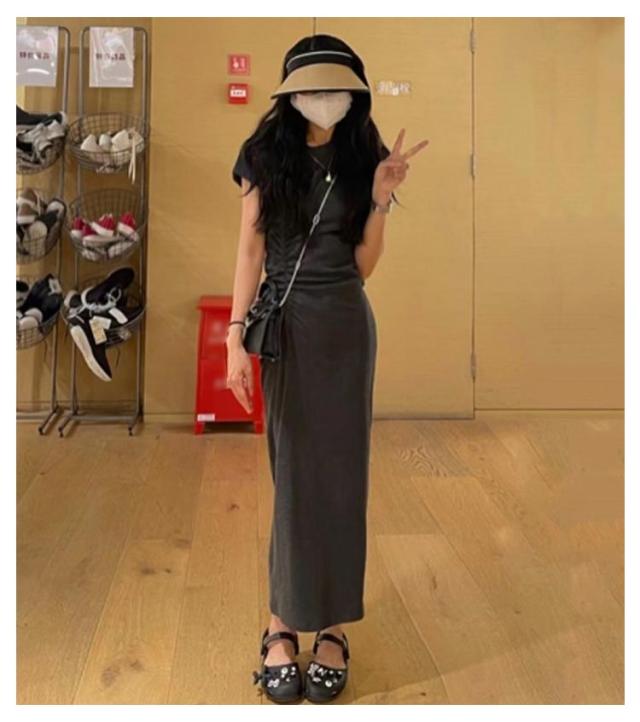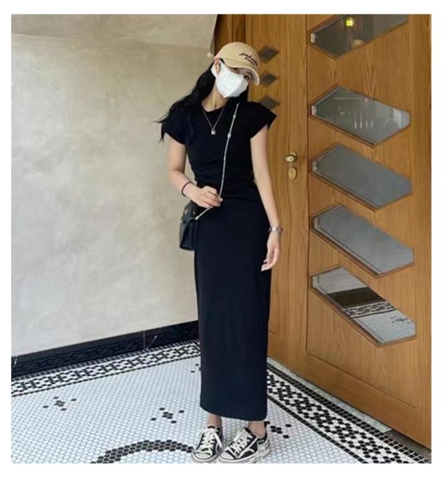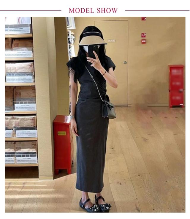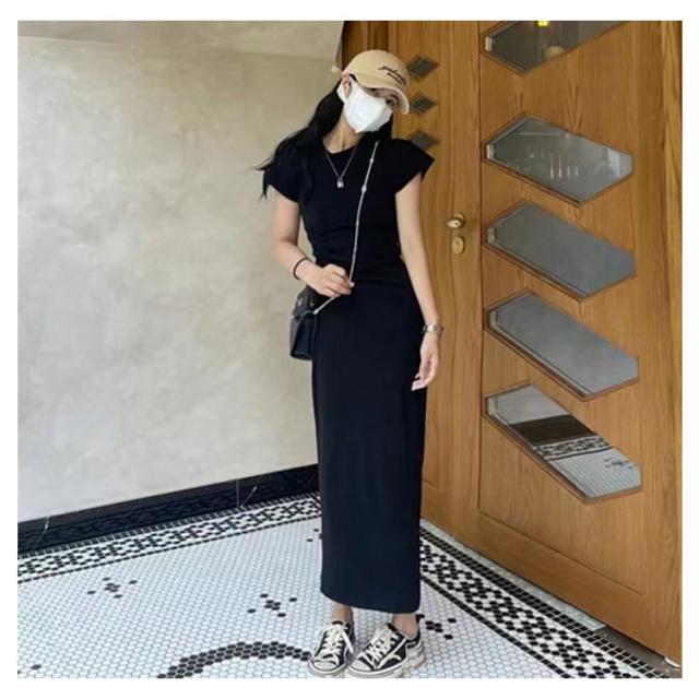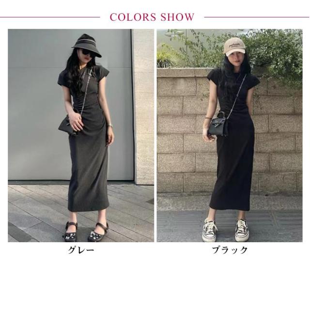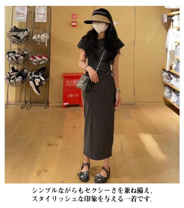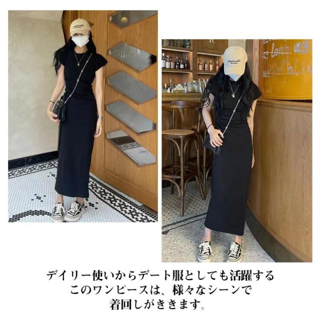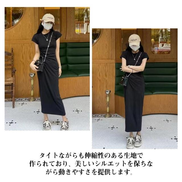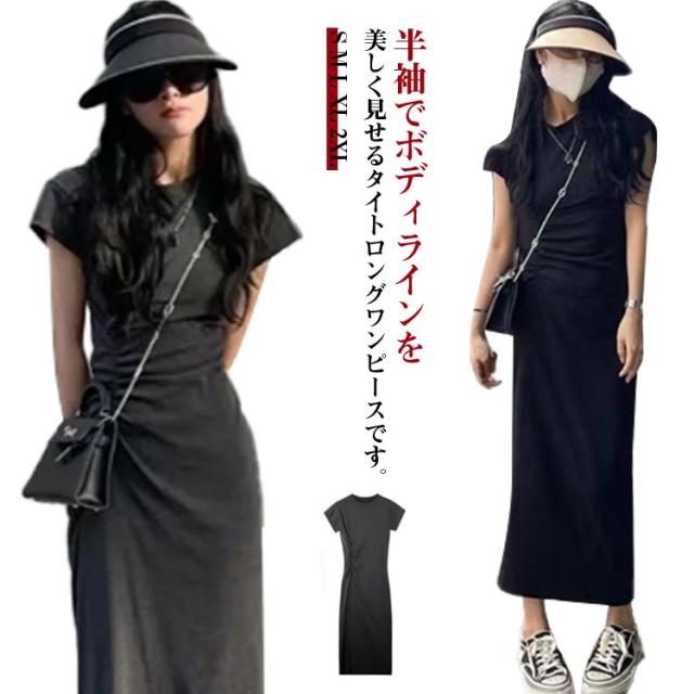 半袖 ワンピース レディース 春 夏 春夏 黒 Tシャツワンピ タイトワンピ スリム タイト ウエストギャザー ブラック シンプル カジュアル Tシャツワンピ 細身 Hライン 大人 Tシャツ カットソー ワンマイルウェア 無地 20代 30代