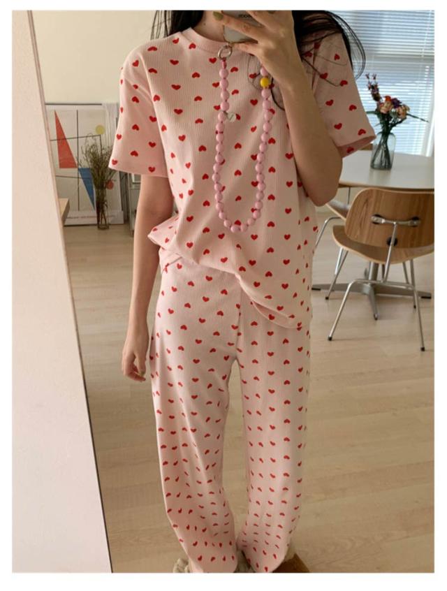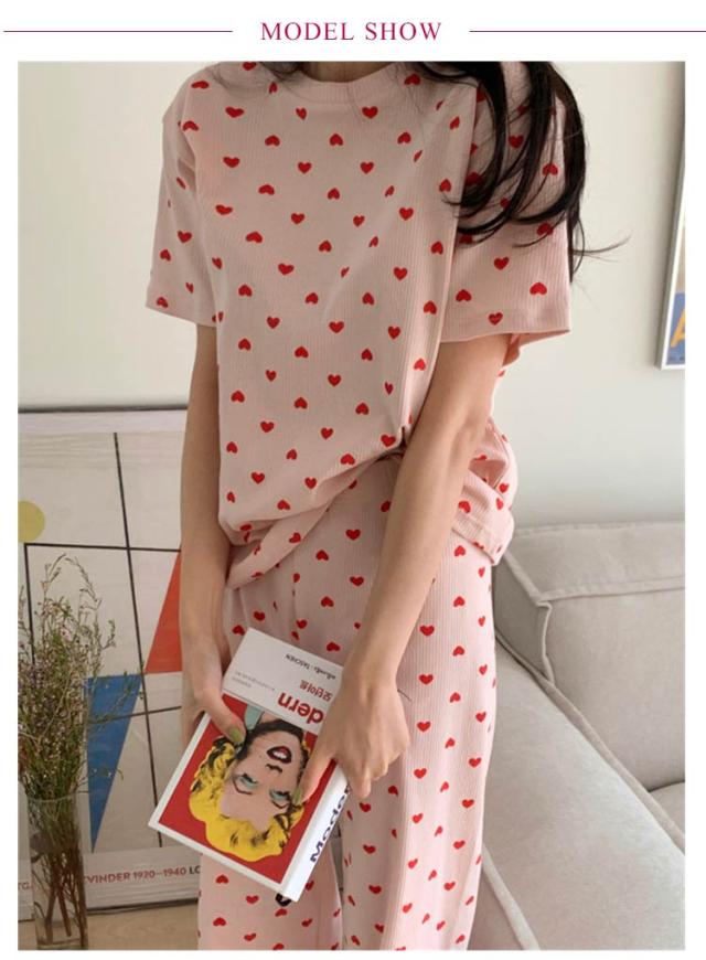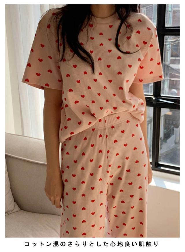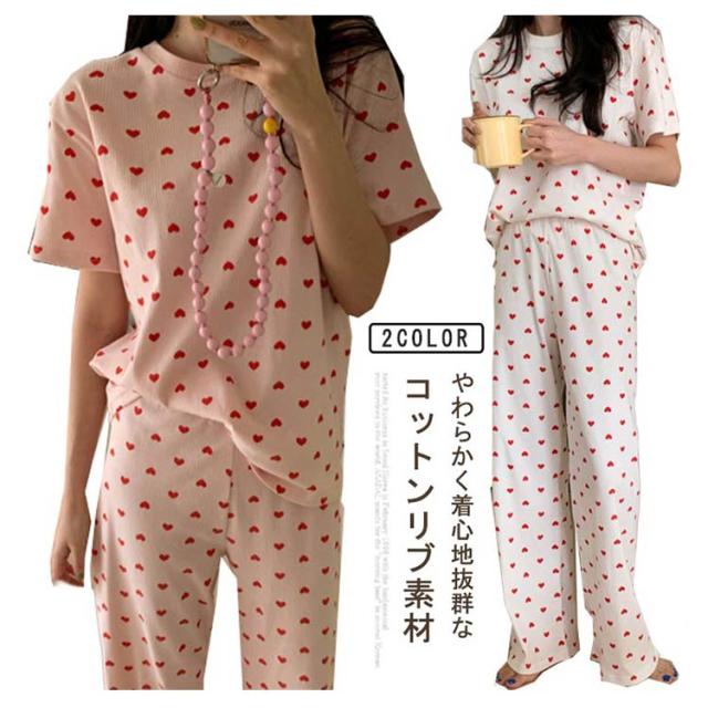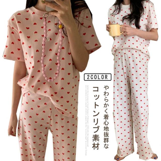 ルームウェア セットアップ 上下セット レディース 夏 ワンマイルウェア 部屋着 パジャマ 寝間着 寝巻き リブ リブニット 半袖 tシャツ ロング パンツ 2点セット 半袖tシャツ ラウンドネック 丸首 ロングパンツ ハート