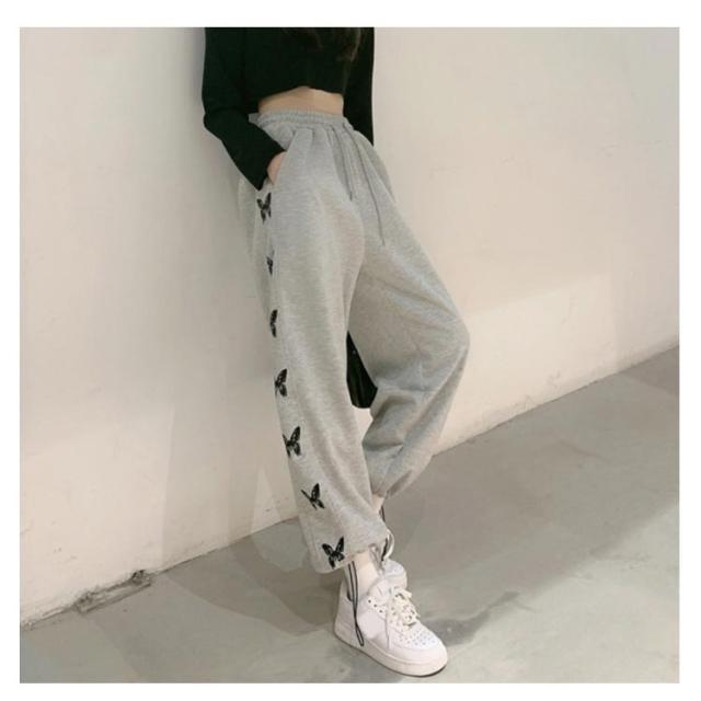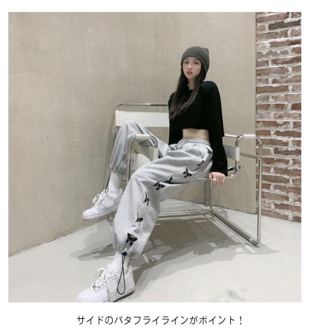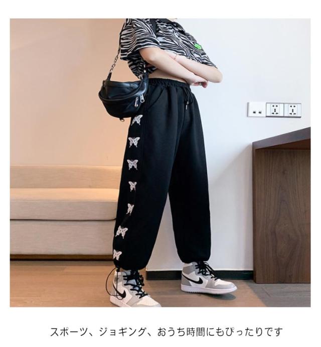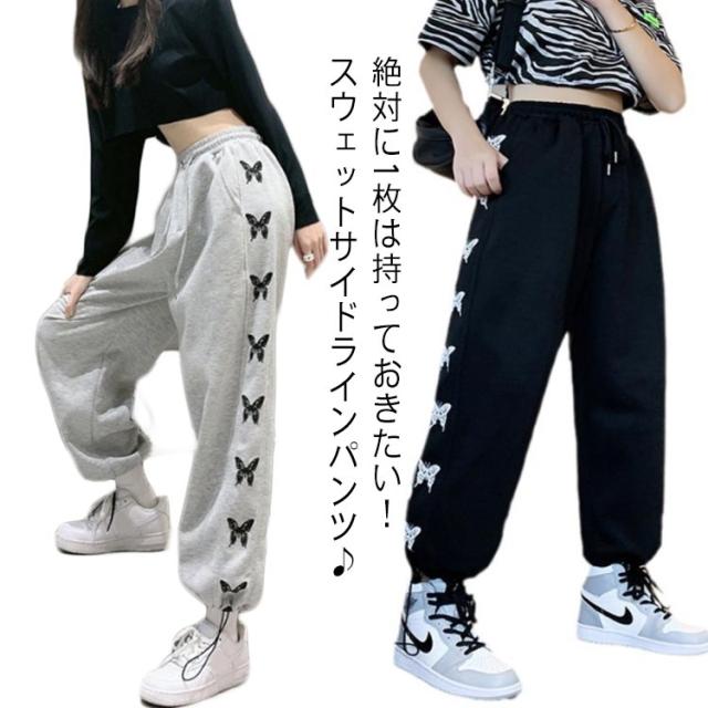 ジョガーパンツ スウェットパンツ ワイドパンツ サイドバタフライラインパンツ ボトムス 蝶 トラックパンツ イージーパンツ グレー ブラック ダンス 練習着 ウエスト ゴム レディース ルームウェア スポーティ ストリート 部屋着 ロングパンツ 春夏 秋冬