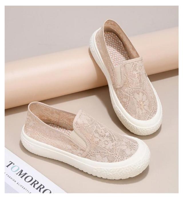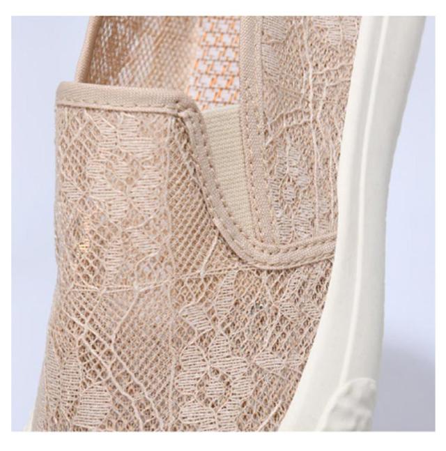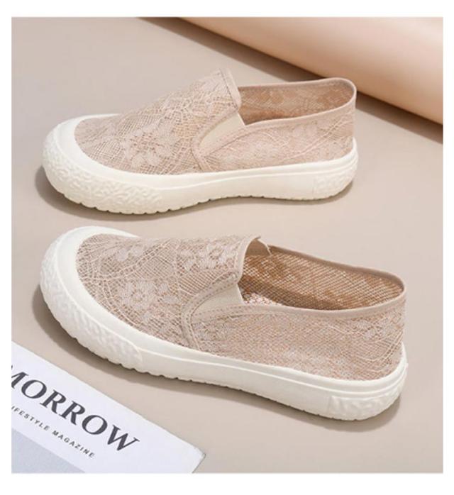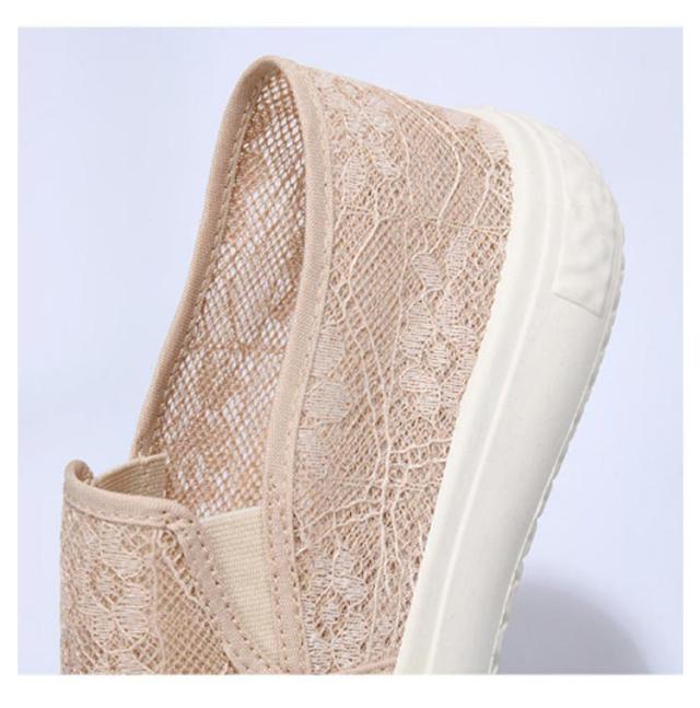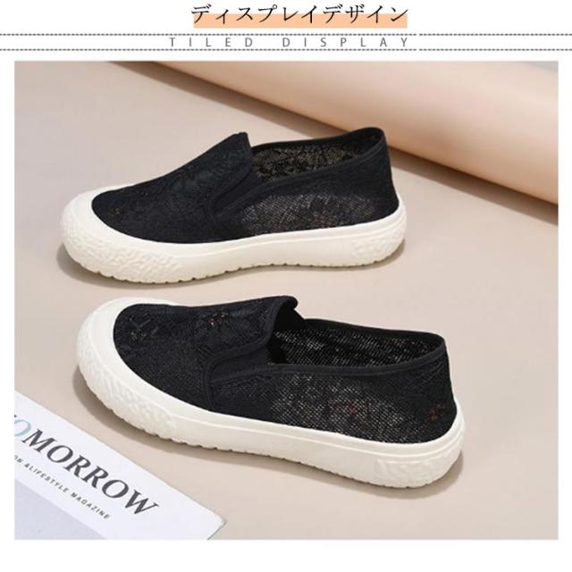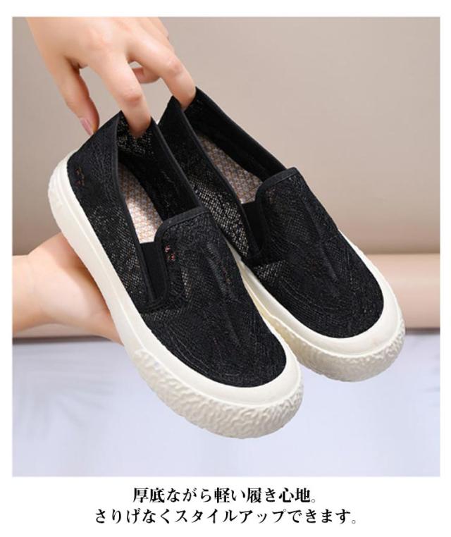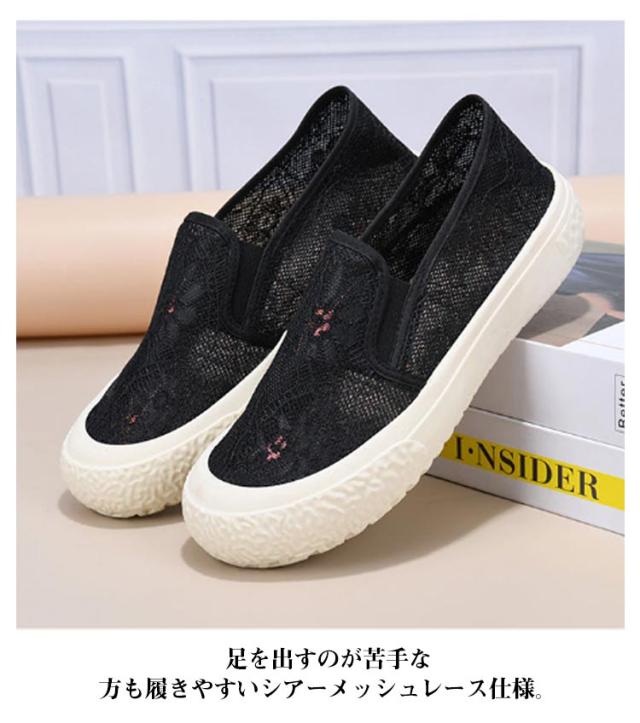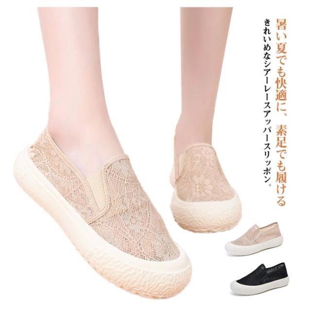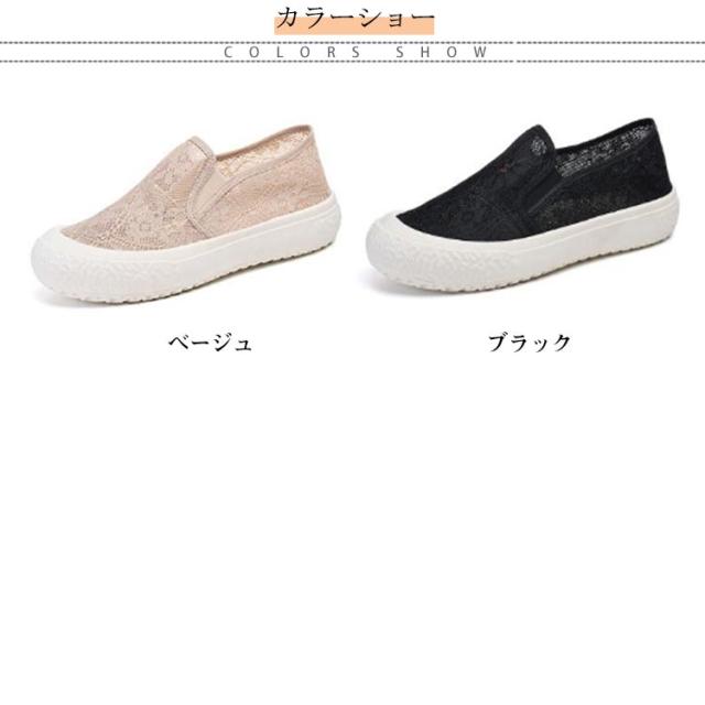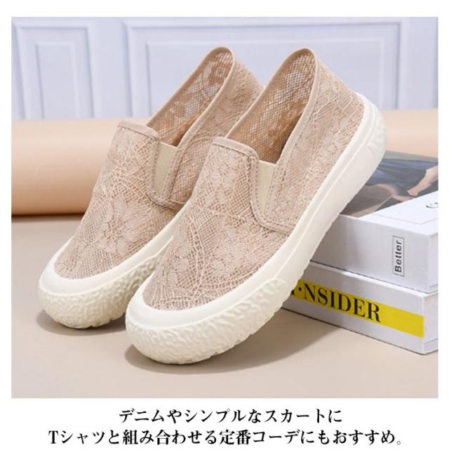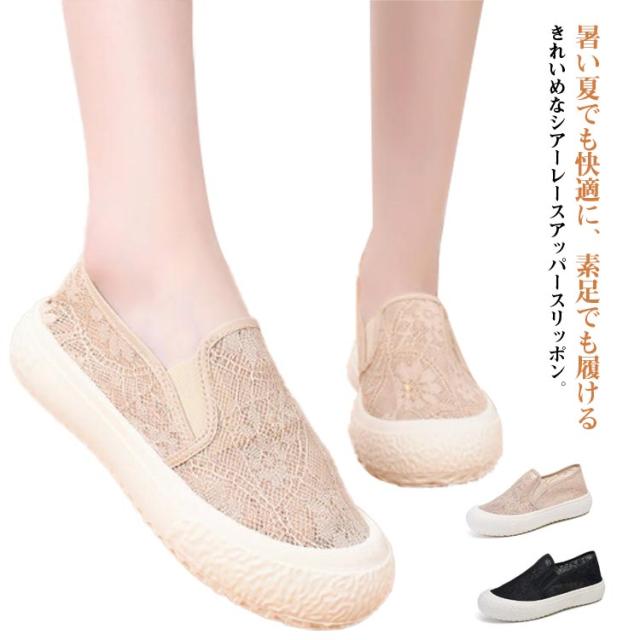 レース スリッポン レディース 紐なし ぺたんこ スリッポンスニーカー 履きやすい ローカット フラットシューズ メッシュシューズ レース ベージュ ブラック 可愛い おしゃれ 通勤 オフィス 春夏 23-25cm