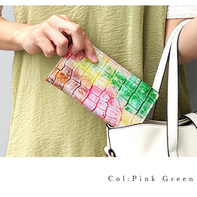 クロコダイルの型押しに顔料で色付けをしたカラフルで遊び心のある牛革を使用しております。
