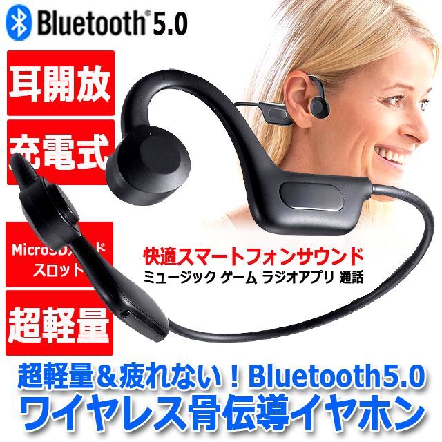 超軽量&疲れない!Bluetooth5.0ワイヤレス骨伝導イヤホン (音楽プレーヤー マイク 充電式 電池不要)