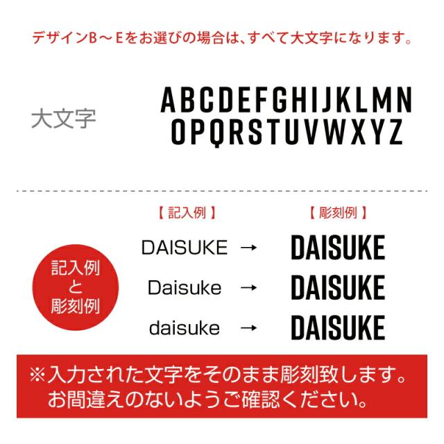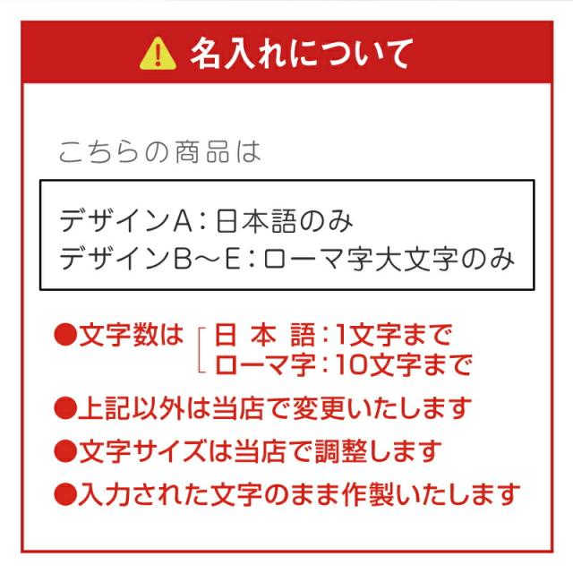 | 名入れ | 彫刻するお名前は「記入欄」へご記入下さい。 デザインA:日本語のみ ※ローマ字不可 文字数は1文字までとさせていただきます。 デザインB〜E:ローマ字 大文字のみ ※日本語不可 文字数は10文字までとさせていただきます。 ※1 Aのデザインは日本語1文字、落款風に彫刻いたします。 ※2 B〜Eのデザインのお名前は「すべてローマ字大文字」にて彫刻いたします。 |