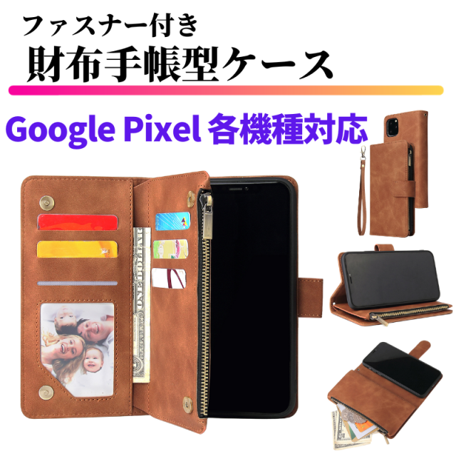 Google Pixel ケース 手帳型 レザー お財布 シンプル カードケース 軽量 カード収納 スタンド ストラップ付 耐衝撃 ジップ付 手帳 財布 スマホケース Pixelケース カバー Pixel10 9a 8 8a 8Pro 7a 7 7Pro 6a 6 6Pro 5a 5G 4 4XL 4a 4a5G 3a 3aXLグーグル ピクセル ブラウン