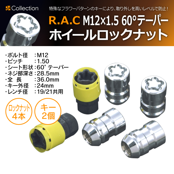 【在庫限】R.A.C ホイルロックナット M12 × 1.5 60°テーパー ネジ部 28.5mm 全長 36mm 4本入り キー2本付き(商品コード:500804)