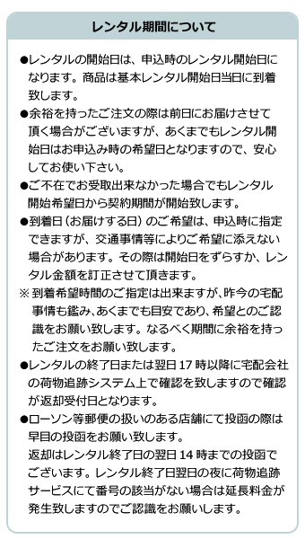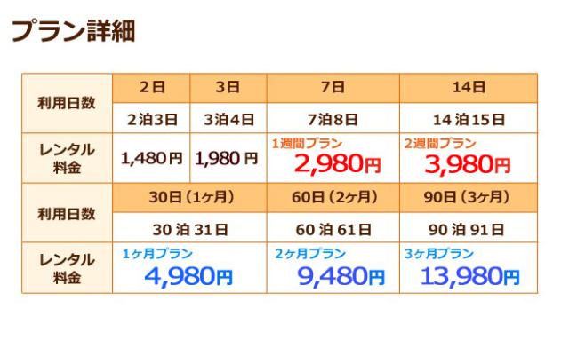 ![]() レンタル1週間プラン | ![]() レンタル2週間プラン | ![]() レンタル1ヶ月プラン | ![]() レンタル2ヶ月プラン |