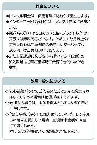 | ご利用したい場所で電波が入らない場合でもレンタル料金は発生してしまいます。 必ずご利用される場所の提供電波状況を先にご確認下さい。 ※回線はドコモ回線を使用してますので、安定した電波、どこよりも広いエリアをカバーしてお使い頂けます。 また当然でございますがお客様の端末が SoftBank、au、その他 i Padなど、 タブレット等端末はキャリアに関係なく使えます。 | レンタル期間を過ぎてもご返却が無い場合、(荷物追跡番号にて確認出来ない場合) 1日あたり1,080円の延滞料金が発生します。 予定日より更にご利用される場合はまずメールか電話(03-6914-2304)にて ご連絡をお願いします。通常の延長手続きをご案内致します。 |