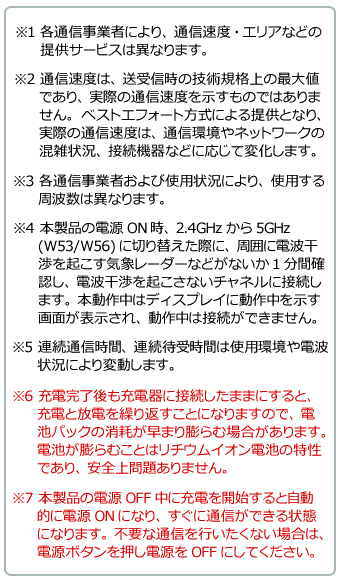 | ご利用前に、下記のご注意点を必ずご確認ください。 ●あくまでも月間の通信量制限は無制限です。ただし連続3日間のデータ通信容量が合計3GBを越えた日の、翌日0:00〜24:00まで通信速度が低下します。 上記の通り連続して3日間の合計ですので、多く使った日の翌日、翌々日は自制しお使い頂く事を推奨します。 ●1日1GB使うってどれくらい?(おおよそ目安としてご認識下さい) yahooのトップページ表示・・・3400回 300文字程度のテキストをメール・・・205000回 LINE音声通話・・・約2,040分(32時間) ビデオ通話・・・204分(3時間ちょい) youtubeなどの動画(画像により大きく変化) 低画質の場合・・・スマホ5時間26分 PC2時間程度 標準画質の場合・・・スマホ166分程度 PC55分程度 ニコ生 低画質・・・370分 【ご参考に】 1GB(ギガバイト)=1024MB 1MB(メガバイト)=1024KB 1KB(キロバイト)=8パケット ●通信容量の追加販売は行っておりません。 ●通信速度低下に関してご案内の通知は行っておりません。 ★本製品の電源OFF中に充電を開始すると自動的に電源ONになり、すぐに通信ができる状態になります。 ★本製品が電源が入ってる状態ですと何かしら通信を拾ってしまうものです。 よって少しでも不要な通信を行いたくない場合は、電源ボタンを押し電源を気づく限りOFFにして頂くと容量の節約になります。 3日間で3GBを超えずにご利用いただければ低速化はいたしません。 快適なWiFiライフをお楽しみ下さい。 |