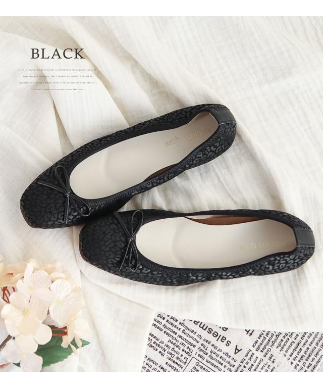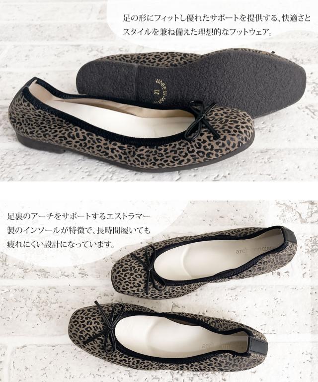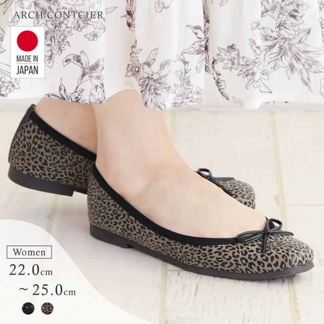 日本製 パンプス 痛くない 柔らかい ローヒール 歩きやすい フラットシューズ バレエシューズ コンフォート フラットシューズ アニマル柄 ヒョウ ゼブラ スクエアトゥ リボン 婦人靴 ARCH CONCIER アーチコンシェル 45242