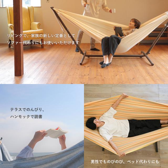 | サイズ | 【ハンモック】全幅:約160cm × 全長:約340cm × 寝床部の長さ:約220cm 【スタンド】横幅:約268cm × 奥行き:約100cm × 高さ:約100cm |