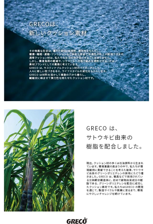 | GRECOは、新しいクッション素材 その特異な形状は、優れた耐久・反発性、通気性をもたらし、 健康・睡眠・運動・ファッションなど多彩な用途で快適性の向上が期待できます。 通常クッション材は、私たちの生活の中で目にすることはありません。 しかし、環境負荷の軽減や、リサイクルへの取り組みを透明化することは、 素材ブランドとしての責務と考えています。 GRECOは、サスティナブルクッション材のパイオニアとして、 人々に新しい気づきを与え、ライフスタイルの変化をもたらします。 GRECO は材料を溶かして複数の穴から垂らし、 繊維状に絡ませて弾力性を持たせたクッション材です。 GRECOは、サトウキビ由来の樹脂を配合しました 現在、クッション材の多くは石油原料から生まれています。 環境意識の高まりの中で、私たちが環境維持に貢献できることを考えた結果、 サトウキビ由来のグリーンポリエチレンの採用にたどり着きました。 GRECOは、寝具などで採用されている立体網状構造体に、 初めて植物由来成分の樹脂である、 グリーンポリエチレンを配合に成功したクッション素材です。 私たちはGRECOの開発を通じて、 製造サイクルや廃棄に至るまで環境にやさしいチャレンジを続けています。 |