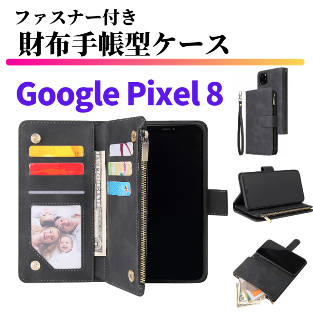 Google Pixel 8 ケース 手帳型 お財布 レザー カードケース ジップファスナー収納付 おしゃれ スマホケース 手帳 Pixel8 ブラック ピクセル8