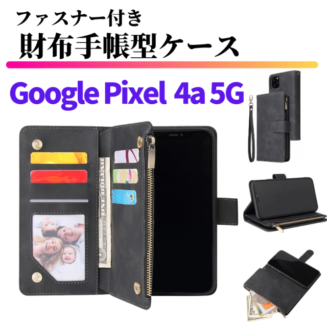 Google Pixel 4a 5G ケース 手帳型 お財布 レザー カードケース ジップファスナー収納付 おしゃれ スマホケース 手帳 Pixel4a5G ブラック ピクセル4a5G