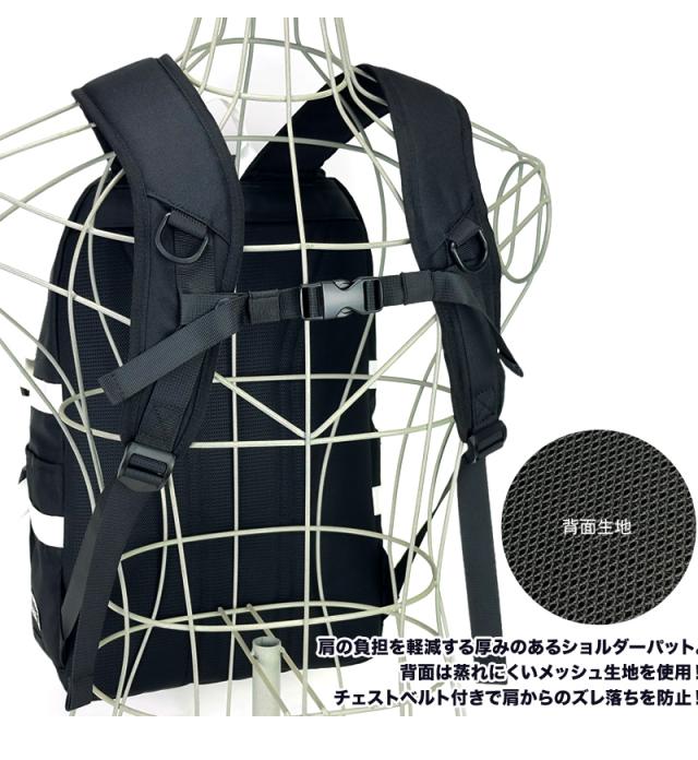 肩からのズレ落ち防止に便利なチェストベルト付き。