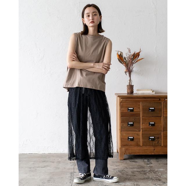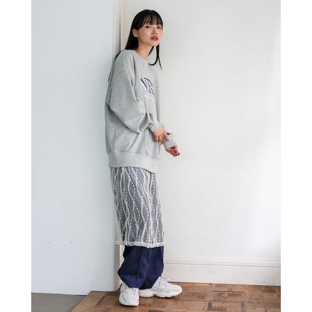 デニムパンツとのレイヤード相性はもちろん、スラックスやジャージ、スカートとのレイヤードも。