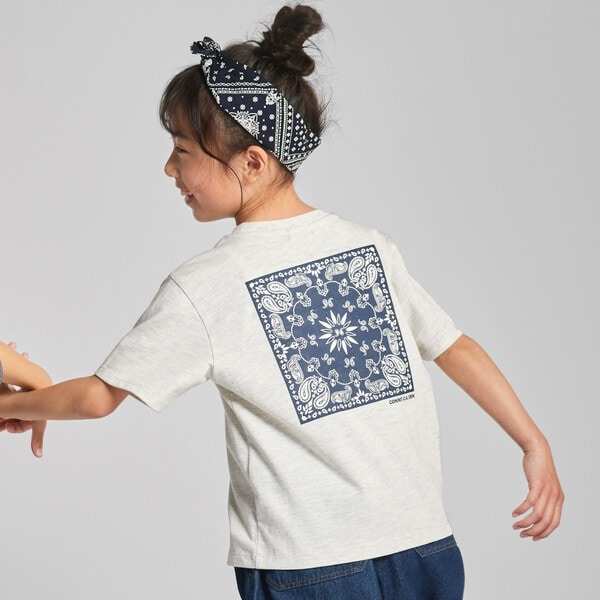 後ろにはバンダナ柄をプリントした、シンプルで新鮮な半袖Tシャツです。