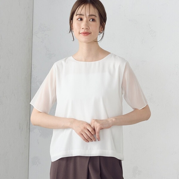 オン/オフで活躍する、ブライトシフォンを使用したシンプルなTシャツ型のトップス。