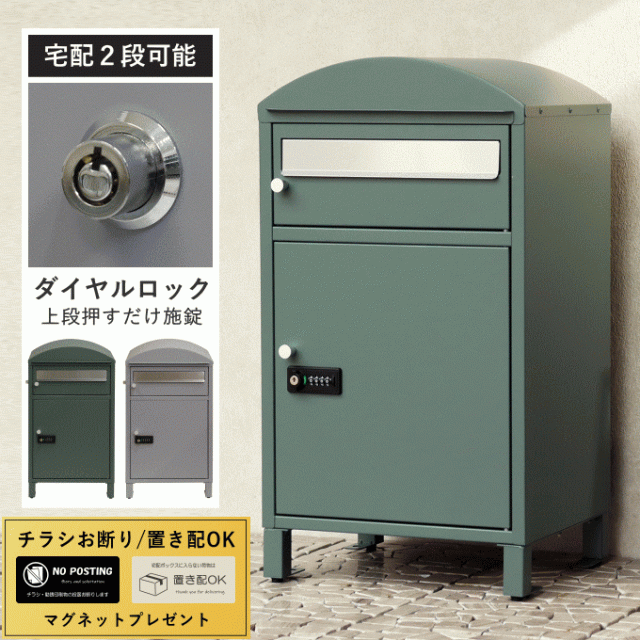 | 郵便物、宅配物どちらも不在時に、荷物を受け取れるポスト付き宅配ボックス又はポスト一体型宅配ボックス。忙しいあなたや、配達の方にも優しい商品です。 ダイヤルロックとシリンダー錠(ダイヤル解錠番号が分からなくなった際の緊急用)の組み合わせタイプの鍵を使用しており防犯性が高いです。 高級感のある郵便受けが個性ある玄関を演出する宅配BOXです。 【セキュリティー】 上段は、プッシュキーで簡単に鍵の開閉が可能で、防犯面にも安心です。また、スペアキーが1本付属しております。 下段のダイヤルロックは、鍵を施錠した際、鍵を解錠した際にダイヤル番号が「0000」にリセットされ、設定したダイヤル番号の漏洩の心配がありません。 【上段宅配ボックス使用可】 扉側に捺印用の印鑑ホルダーが2個付属しており、上段も宅配ボックスとしての使用が可能です。マグネット式で任意の場所に取り付けることが可能です。※印鑑はご自身でご用意ください。 上段の投函口は大きなサイズ設計で、ネコポスやゆうパケットポストが投函可能です。 【配達マニュアル付き】 キー(2段すべて)、アンカーボルト、キーフック付印鑑ケース、宅配業者用の配達マニュアル(マグネット式でお好きな場所に貼付け可)が付属しており、お客様で追加でご用意 頂くものは特に必要なく、すぐにご使用頂けます。 【デザイン】 カラーは、明るいグレーのクールグレーと、落ち着いた緑のフォレストグリーンの2色展開になります。投函口部はステンレス素材を使用したデザインになります。 【錆びにくい加工】 ガルバナイズド処理を施している為、錆の発生がしにくい仕様となっております。 ※防水加工は施しておりませんので、軒下や屋根がある場所への設置を推奨致します。 【アンカーボルト付属】 脚部に地面固定用のアンカーボルト穴があり、地面と商品を固定することも可能です。 |
