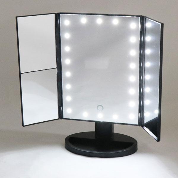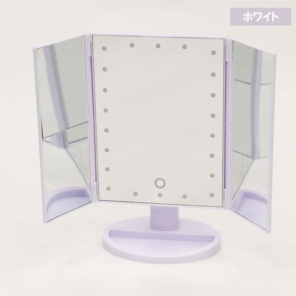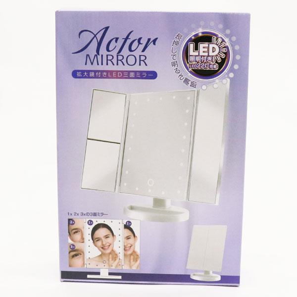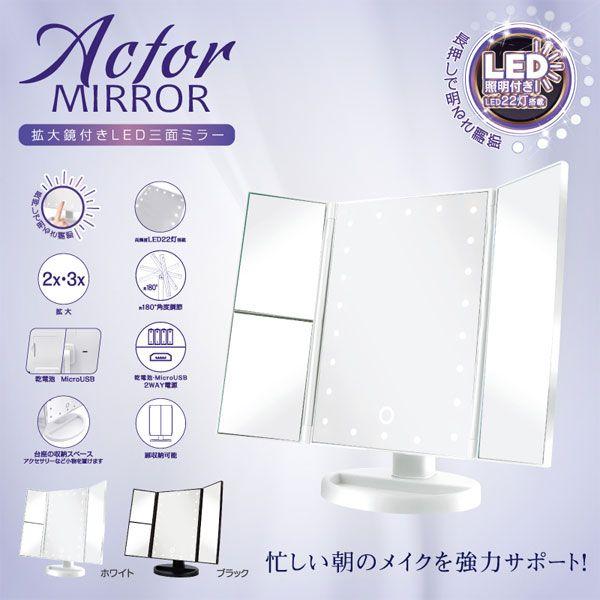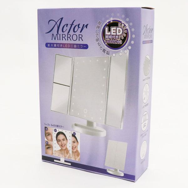 HIRO アクターミラー 拡大鏡付きLED三面ミラー ホワイト LED22個搭載 角度調整可 忙しい朝のメイクをサポート HDL-8859