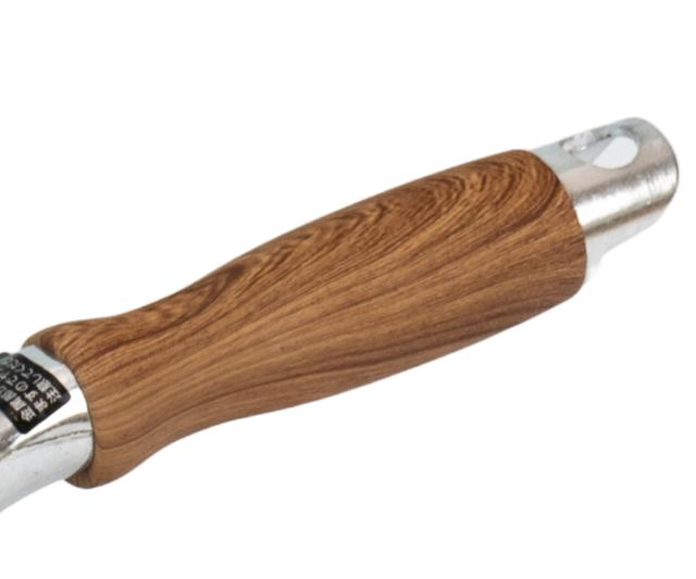 握りやすい木目調のハンドルは樹脂製なので、デザイン性に優れているだけでなくお手入れも簡単です。ハンドルに引っ掛け穴があいているので、掛けて収納することもできます。