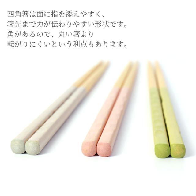 | 商品説明 | マットな質感の薄付きカラーは素朴で落ち着きがあり、ナチュラルな雰囲気を醸し出す上品な木製箸です。 使うたびに手に馴染み、日常に彩りを添えてくれます。 毎日、口に運ぶものだから、お気に入りの一膳を。 お気に入りの箸で毎日の食事をこだわりたい。 普段使いの生活箸としておすすめの上質なお箸です。 箸先はザラザラのすべり止め加工付きなので、つるつるすべりやすい麺類もしっかりキャッチできます。 手に持てば指先にやさしく、口に運べば口当たりやわらかく。 自然のぬくもりを感じさせる木製品は、長く使うほどに手になじみ、つややかな風合いが加わります。 食洗機対応ですので洗い物も楽になります。 四角箸は面に指を添えやすく、箸先まで力が伝わりやすい形状です。 角があるので、丸い箸より転がりにくいという利点もあります。 また、くびれた部分は指にフィットしやすいため、持ちやすさが向上します。 指に合わせた形状であるため、滑りにくく、しっかりと握ることができます。 お箸は毎日使う物ですのでご贈答にも適しています。かさばらないのでちょっとしたお返しにも喜ばれますね。 日本文化のお箸は、海外の方へのプレゼント、お土産にも喜ばれます。 |