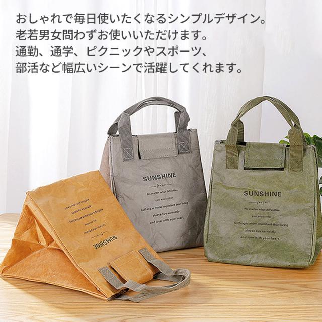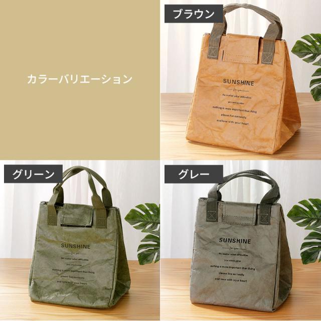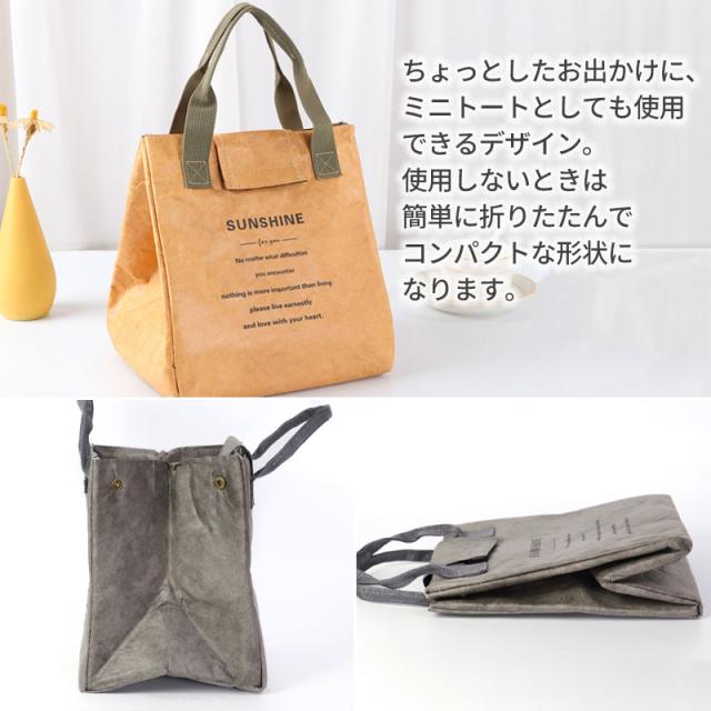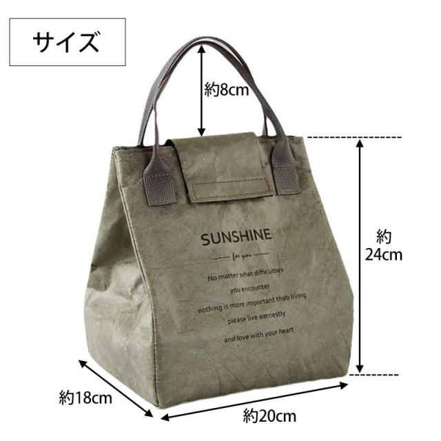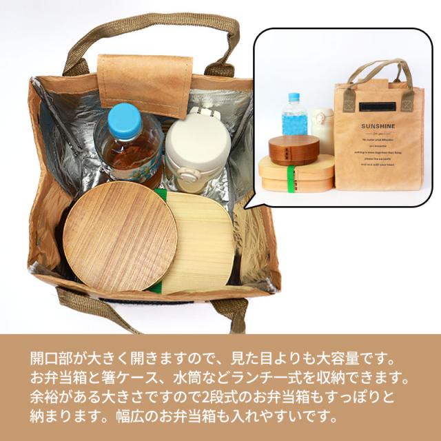 | 商品説明 | ランチバッグの表面は高密度ポリエチレン素材を使用し、クラフト調のおしゃれな見た目ながら強度と撥水性に優れた素材です。 内側にはアルミシートと断熱材で裏打ちしていますので保冷、保温、防水効果があります。 3層構造により保冷、保温、強度、耐久性に優れています。 開口部が大きく開きますので、見た目よりも大容量です。 お弁当箱と箸ケース、水筒などランチ一式を収納できます。 余裕がある大きさですので2段式のお弁当箱もすっぽりと納まります。 口元が大きく開くので、幅広のお弁当箱も入れやすいです。 おしゃれで毎日使いたくなるシンプルデザインで、老若男女問わずお使いいただけます。 通勤、通学、ピクニックやスポーツ、部活など幅広いシーンで活躍してくれます。 ちょっとしたお出かけに、ミニトートとしても使用できるデザイン。 使用しないときは簡単に折りたためコンパクトな形状になります。 |