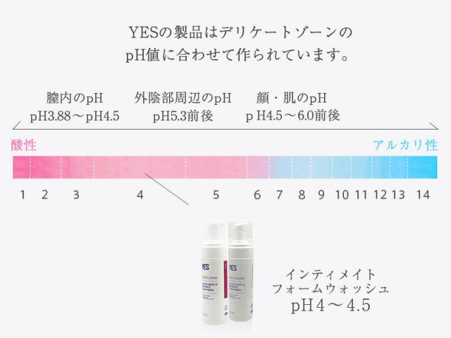 デリケートゾーンは顔やカラダとは異なるpH値を示す特殊な環境。顔や身体が弱酸性なのに対して、デリケートゾーンの粘膜はバランスを保つため、より酸性寄りに保たれています。皮膚も非常に薄いため、刺激の強いアルカリ性のボディソープで洗うと かぶれ、必要なバリア機能まで強い洗浄力によって洗い流してしまいます。そうでなくても、ストレスや日常生活の乱れによってデリケートゾーンはアルカリ性に傾きトラブルをもたらしやすくなってしまいます。 そうならないためにもデリケートゾーンのpH値に合わせたデリケートゾーン用の弱酸性ソープで洗い、酸性を保つことが、トラブルを寄せ付けない健やかな肌環境を整えることに繋がります。 ![]() YESの専用ソープは身体の中で もっともデリケートなゾーンの pH値レベルに合わせて作られています。 「デリケートゾーン用ソープ 」とひと口にいっても、アルカリ性に近いpH値のものもあります。 YESの製品はデリケートゾーンの特性を考え、外の陰部周辺のpH値5.3前後ではなく、 3.88〜4.5の「膣内のpH値」に合わせて製品を作っています。デリケートゾーン用ソープ だから大丈夫ではなく、より繊細な ゾーンの pH値に合わせて作られたソープ でケアするのが大切です。pH値がきちんとコントロールされた YESの製品 を使うことで、デリケートゾーンに刺激を与えることなくケアすることができます。 | ||||||||||||||||