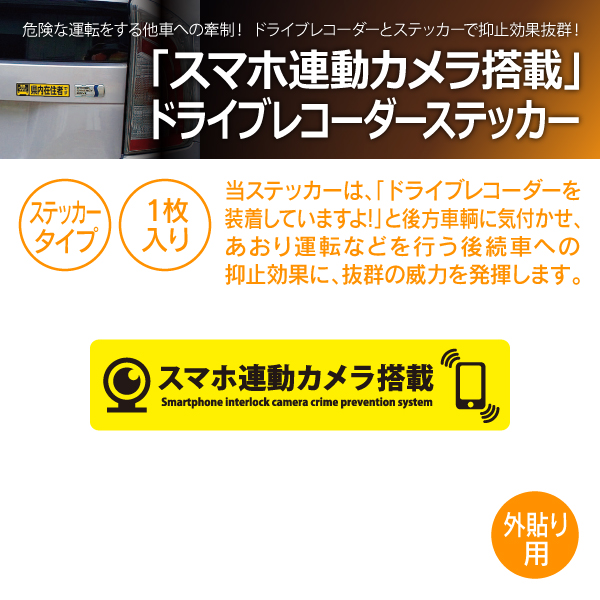 当ステッカーは、「ドライブ レコーダーを装着していますよ!」と後方車輌に気付かせ、あおり運転などを行う後続車への抑止効果に、抜群の威力を発揮します。