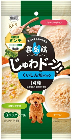 4970768722673南九州で育った国産鶏肉のじゅわドーン!な旨味を愛犬にお届け♪鶏肉と野菜や魚など異なるジャンルのトッピングが楽しめる3種類のパウチが入ったバラエティーパック。なんでも美味しく食べるくいしん坊な愛犬におすすめ!高齢犬や歯のない子も食べやすい、粗挽きミンチの鶏肉が入ったミンチタイプ。とろ〜りあんに溢れた鶏肉の旨味がじゅわと溢れ、ドーンと口の中に広がる贅沢な味わい。
