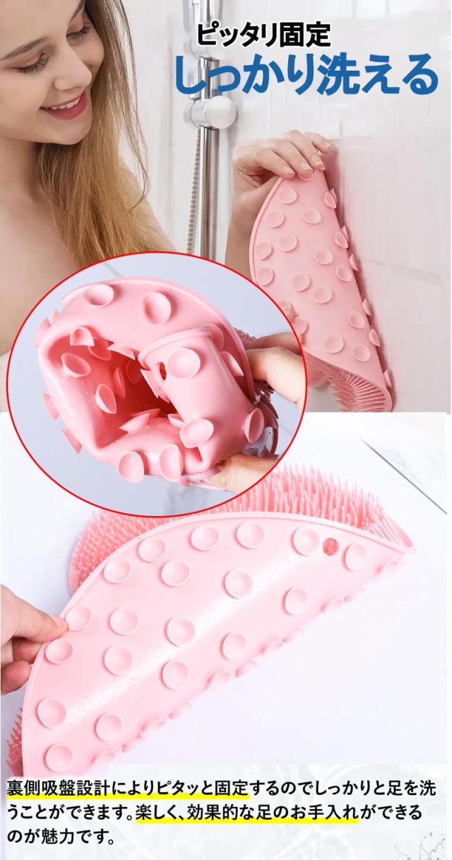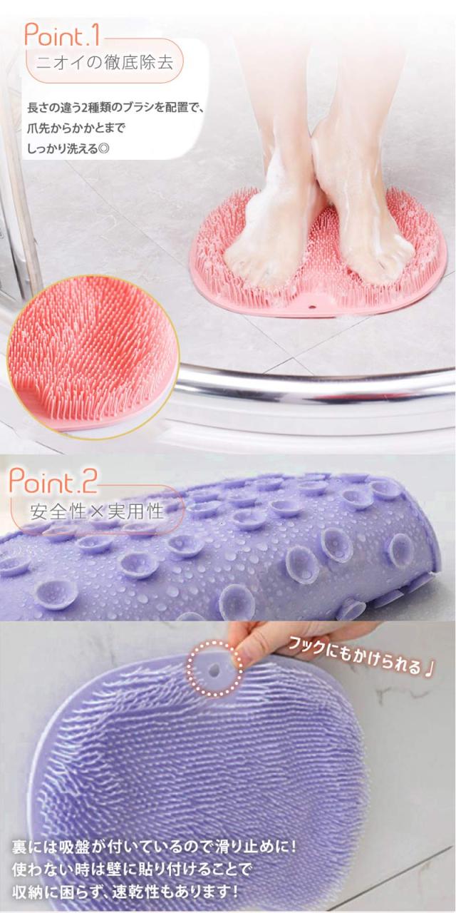 足元マットとして古い角質や角質に潜む菌少しずつ除去して、足の臭いの問題を改善できて、足の肌を柔らかくてすべすべになります。足裏マッサージ 効果もあるため、足先毛細血管の血行促進を促し、冷え性やむくみ改善も期待できます。背面に吸盤がついているので、壁に貼って背中をマッサージすることができ、背中に手が届きにくい、洗えないといった悩みを解決できます。 もちろん、垢すり用のボディブラシとしてもおすすめいたします。
