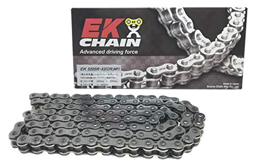 ☆商品説明☆ EK520サイズ QXリングシールチェーン EK520SR-X2 (CR;NP) シルバーカラー ?江沼チヱン製作所の販売するシルバーは、外プレートのクロームカラーメッキが深みと高級感をかもし出すシルバーです。 車輌メーカーに純正採用されている?江沼チヱン製作所が石川県加賀市にある工場で製造する安心の日本製。 本製品は、街乗りからロングツーリング等、幅広いシーンに使える卓越したバランス性能をもつ「ストリート用 シールチェーン」です。 低フリクションで長寿命の「QXリング」を採用。 チェーン内プレートには、EK独自の「穴あきプレート」技術を採用し軽量化されています。必要なリンク数で購入でき「~650?まで」の小中排気量車種に最適な商品です。 ※カシメジョイントMLJ 同梱/取付けには専用工具が必要です。 製品の取扱について下記を必ずご一読の上、購入、使用ください。