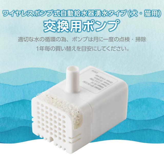 エレコム ワイヤレスポンプ式自動給水器湧水タイプ(犬・猫用)「サイレントアクア」(型番:PET-WD02BK、PET-WD02WH)専用の交換用ポンプです。動作音が気にならない超静音設計です。