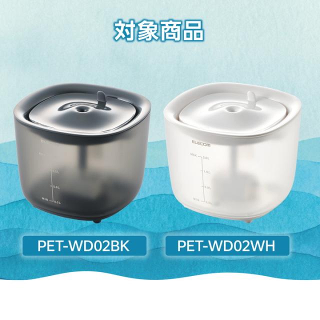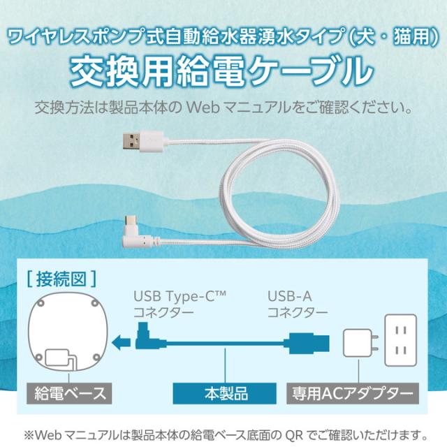 エレコム ワイヤレスポンプ式自動給水器湧水タイプ(犬・猫用)「サイレントアクア」(型番:PET-WD02BK、PET-WD02WH)専用の交換用USB給電ケーブルです。ケーブルの外部被覆(シース)はナイロン製で、ワンちゃん・ネコちゃんの噛みつきやいたずらによる断線が起きにくいメッシュタイプです。