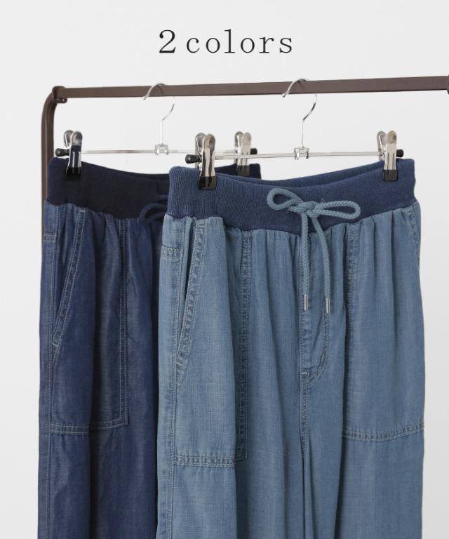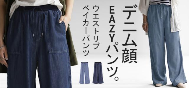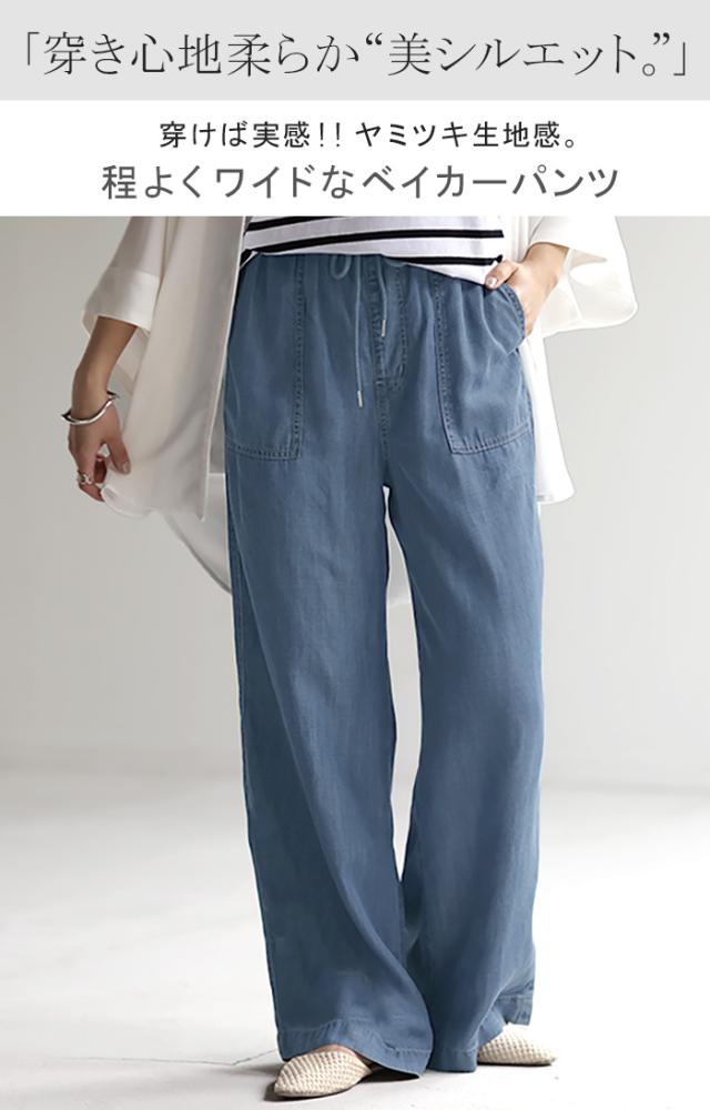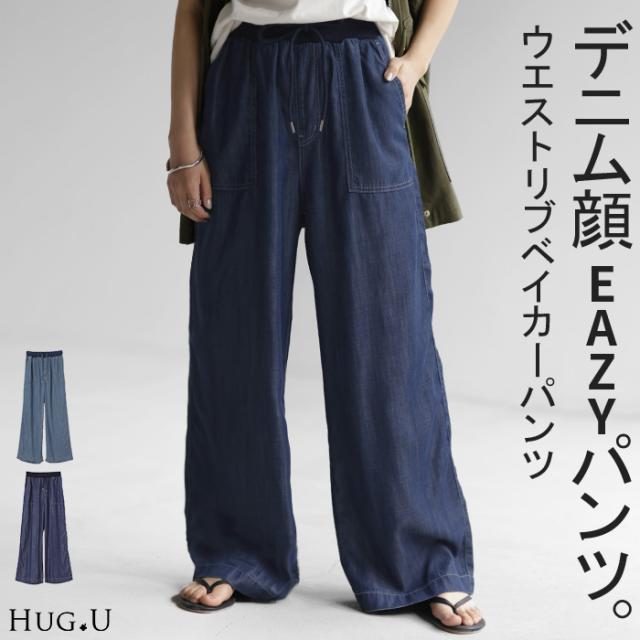 パンツ デニム 風 イージー ワイド レディース ベイカー デニムパンツ ワイドパンツ バギーパンツ ジーンズ ジーパン ボトム 体型カバー ボトムス ハイウエスト ズボン ゴム ベイカーパンツ フレアパンツ 大きいサイズ 楽ちん 薄手 リブ 春 夏 HUG.U 秋新作
