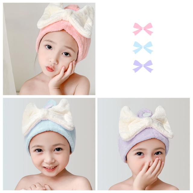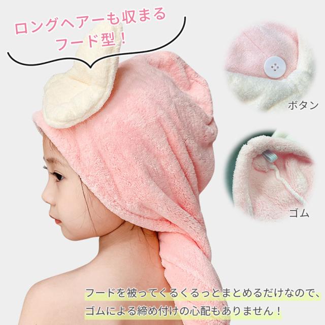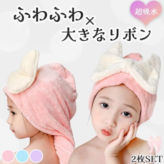 タオルキャップ 3色選べる 2枚セット ふわふわ 吸水 フード型 マイクロファイバー リボン りぼん お風呂 ドライヤー プール 海水浴 スイミング ヘアキャップ ヘアバンド ヘアターバン ヘアタオル お風呂上り 女の子 男の子 子供 子ども こども ドライ 髪の毛 かわいい