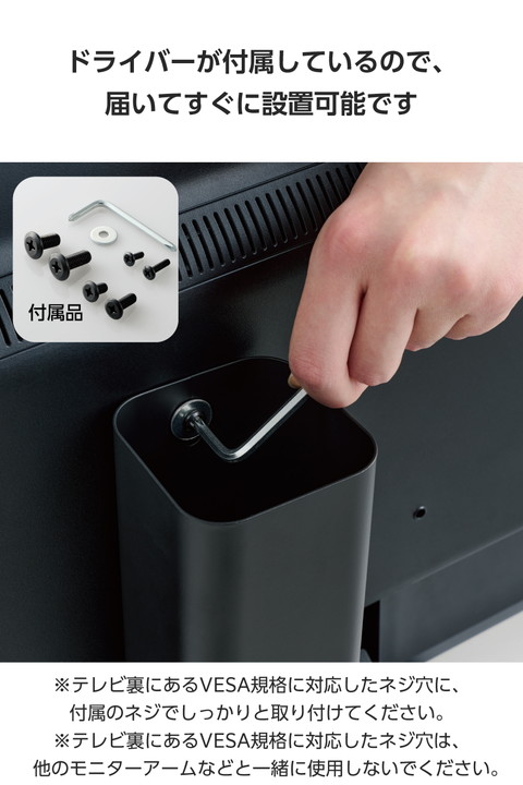 テレビ裏に隠して収納可能!VESA穴に取り付けることができるクリーニングブラシケースです。別売りのクリーニングブラシ(KBR-AM012AS/AVD-TVBR03AS)にぴったりフィット。ボードやデスクに直置きすることも可能です。![]() ■VESA穴に取り付けることができるクリーニングブラシケースです。 ■テレビ裏に隠して収納可能。テレビ周りを整理整頓することができます。 ■別売りのクリーニングブラシ(KBR-AM012AS/AVD-TVBR03AS)にぴったり入るサイズです。 ■大きめサイズで、幅広いサイズのブラシを収納できます。 ※耐荷重:約500g ■ボードやデスクに直置きすることも可能です。 ■スチール製で重量感があり安定するため、ブラシを取り出す際も倒れにくいです。 ■※製品本来の用途以外で使用することはお止めください。 ■※テレビ裏にあるVESA規格に対応したネジ穴に、付属のネジでしっかりと取り付けてください。 ■※設置後、製品が固定されているか確認の上ご使用ください。 ■※テレビ裏にあるVESA規格に対応したネジ穴は、他のモニターアームなどと一緒に使用しないでください。 ■※製品を移動させる際は、接着面などを傷つける恐れがあるため引きずらないようご注意ください。 ■※製品周りのホコリは定期的に取り除いてください。 ![]() ■サイズ:幅約70mm×厚み約70mm×高さ約180mm ■最小対応サイズ:40インチ ■カラー:ブラック ■重量:約390g ■材質:スチール(粉体塗装) ■付属品:ネジ(M4×10、M4×15、M6×10、M6×15、M8×15、M8×20)各1個、M4ネジ用ワッシャー、プラスドライバー |