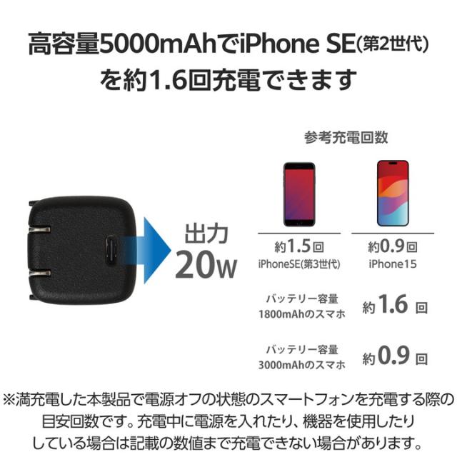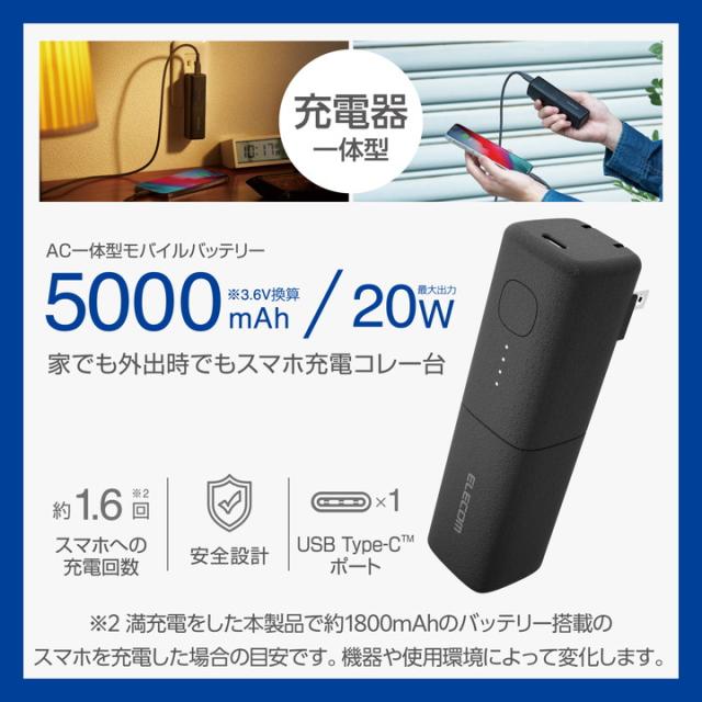 エレコム モバイルバッテリー AC充電器 一体型 5000mAh 小型 USB-C 出力×1 タイプC type-c リチウムイオン電池 おまかせ充電 USB パワーデリバリー 高速充電 20W PSE適合 ブラック┃DE-AC08-5000BK